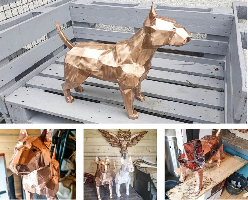 Vorsicht bissig! Das Design dieser tierischen Klempnerskulptur ist einzigartig – die Proportionen sind perfekt – die Ausführung ist gelungen. Einzig das Abwarten, bis aus dem Papierentwurf ein echter Kupferhund entsteht, war schwierig und so bellt das schöne Tier schon heute …