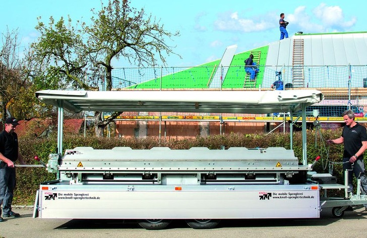 In einer mobilen Spenglerei können Profile und Bleche direkt an der Baustelle gekürzt, gebogen und geformt werden. Mit dem Knoll-Werkstattanhänger sparen Sie Zeit und Geld. Wie das funktioniert, zeigt unser Bericht.