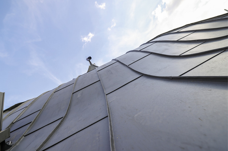 Besonders anspruchsvoll gestaltete sich das Anpassen kleinteiliger Profile an Dacheindeckungsbereichen wie beispielsweise den Übergängen von den Gaubendächern an die Hauptdachflächen. An den vier ebenfalls geschwungenen Gratverläufen wurden die Stehfalzscharen höher aufgestellt, um 90° rückgekantet und mit einer Gratleiste versehen. Zu guter Letzt soll eine Dachspitze in Form einer Eichel das Bauwerk schmücken. Das Zierelement wird ebenso wie das gesamte Dach und die Dachentwässerungsanlage aus farbbeschichtetem 0,7-mm-Aluminium der Marke Haushaut im Farbton Grau – Oberfläche Pearls hergestellt.