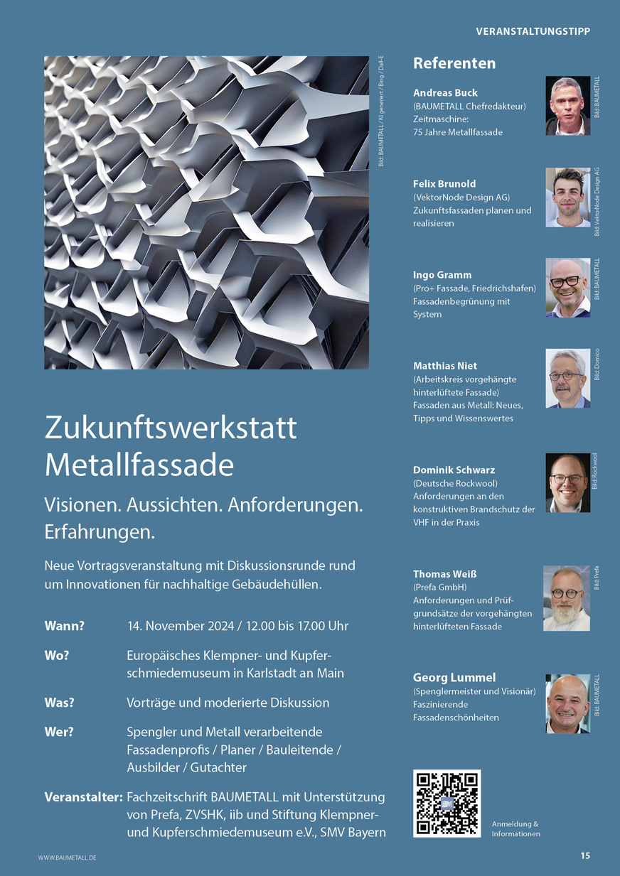 Im Mittelpunkt der Vortragsveranstaltung mit Podiumsdiskussion steht der Austausch zum Thema metallische Gebäudehülle. Schwerpunktthemen sind: Metall-Innovationen, Neuheiten in der Metallverarbeitung, Kreislaufwirtschaft, technische Aspekte in der Unterkonstruktion u.a.
