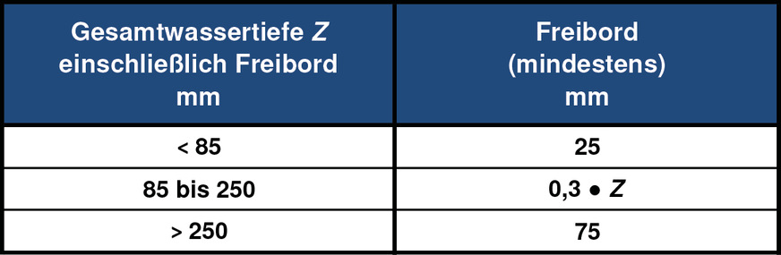 Die Bemessung nach Tabelle 14 der DIN 1986-100 ergibt, dass eine Mindesthöhe des Freibords von 75 mm erforderlich ist.