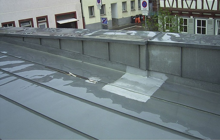 Vorausgegangen war eine Vor-Ort-Besprechung auf dem Dach eines Ballettsaals, zu der ich vor einigen Wochen gebeten wurde. Ein 12 Jahre altes Zinkdach sollte abgerissen und neu gedeckt werden. Zu meinem Erstaunen wies das zu sanierende Dach keine schwerwiegenden Schäden auf. Lediglich einige Dehnungsrisse der Kehl-Anschlussscharen an den aufgehenden Seitenwänden und die viel zu klein dimensionierte Dachrinne fielen mir sofort auf. Auch war eine deutliche Pfützenbildung auf den, ohne Gefälle ausgeführten Attikaabdeckungen zu sehen. Der zuständige Bauleiter schilderte, dass bei stärkeren Regenfällen das anfallende Niederschlagswasser über die Dachrinne schießt und wegen fehlendem Dachüberstand an der Traufe und der Hausfassade entlang läuft, bis es über die Fensteröffnungen und Anschlussfugen ins Gebäudeinnere gelangt. Die verursachten Schäden hielten sich in Grenzen, da das eindringende Wasser immer schnell bemerkt wurde.