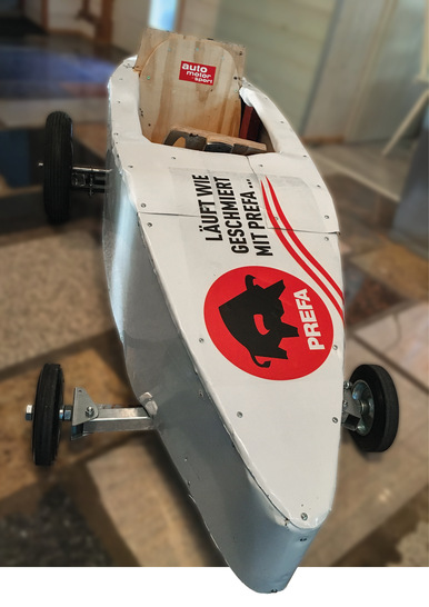 In diesem Beitrag stelle ich einige sehenswerte Prefa-Modelle vor. Klar – es gab auch einige wenige reine Holzmodelle, weil Blech dem einen oder anderen Hobbyschrauber suspekt war. Andere wiederum lobten durchaus die hervorragende Eignung von Prefa-Aluminium zum Bau von Seifenkisten. Das Grundmodell war ausgereift mit starrer gefederter Hinterachse, Kardanlenkung vorne, Luftbereifung und gesponsertem Prefa-Metallgehäuse. Dennoch kostete das Restmaterial wegen der steigenden Materialpreise 100 Euro. Der Satz „Ein Vater ist ein Mann, bei dem Fotos in der Brieftasche stecken, wo früher mal Geldscheine waren“ muss ja nicht zwingend Wirklichkeit werden. Ein Teilnehmer stöhnte, das war der anstrengendste Tag des Jahres – er war wohl einer der anwesenden Bürohengste. Wahrscheinlich wendet er sonst nur Zettel auf seinem überquellenden Schreibtisch. Keine Tätigkeit, die Kinder unbedingt begeistern würde. Zwei besonders talentierte Schrauber-Väter trauten sich sogar an eine Motorisierung wie einst Gottlieb Daimler und Carl Benz. Sie fanden dazu einen 80-ccm-Motor mit 2,6 PS im Internet und bauten ihn erfolgreich ein. Manche Väter schraubten sogar noch bei Nacht mit Taschenlampe, anstatt bei ihren Kindern zu sitzen und auszuruhen. Andere hatten ein besseres Zeitmanagement und betrieben quasi nebenbei noch „Pimp my Car“. Dabei bauten sie Spoiler, Auspuff oder schicke Kotflügel an.