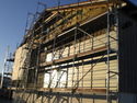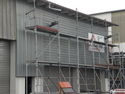 Vor Beginn der Erneuerungsarbeiten im Außenwandbereich der Werkshalle wurde die vorhandene alte Holzverbretterung abgenommen. Dabei war es aus wirtschaftlichen Erwägungen vorteilhaft, dass die gut erhaltene alte Unterkonstruktion, ebenso wie die vorhandene alte Wärmedämmung aus 140 mm Mineralwolle, bestehen bleiben konnte. Für die Montage der neuen SP-Line-Bekleidung erstellte der Handwerker lediglich eine neue Lattung aus imprägnierten Hölzern 40 x 60 mm. Vor dem Aufbringen der Bekleidungsprofile wurden die zum SP-Line-System gehörenden, passenden Anschlussprofile, zum Beispiel für Laibungen, Stürze, Ecken und ähnliches, montiert. Die Verlegung auf den zu bekleidenden Flächen erfolgte, wie schon erwähnt, durch systematisches Aufstecken der einzelnen Paneele. Zur Fixierung im oberen Bereich wurden spezielle Edelstahlbohrschrauben eingesetzt, die jeweils durch die nachfolgende Profilreihe verdeckt werden. Der Einbau der Profile geschah im so genannten wilden Verband mit unterschiedlich versetzten Vertikalfugen. Dabei wurden die 3-m-Basisprofile feldweise „endlos“ verlegt und jeweils am Ende der Teilflächen passend gekürzt. Aufgrund der Verwendung der Paneelabschnitte als nächstes Startpaneel erzielte die Montagefirma eine verschnittfreie Verlegung. Beim Wechsel der Verlegeart von horizontal zu vertikal wurden passende Stoßprofile verwendet und den unteren Abschluss bilden entsprechende Sockel- bzw. Sturzprofile.