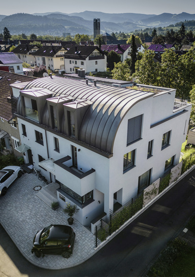 Auf den ersten Blick scheint es, als hätte sich jemand ein privates Sternen-Observatorium auf sein Haus gebaut. Beim genaueren Hinschauen wird klar: Es handelt sich um ein Stehfalzdach – genauer gesagt um ein in der Mitte getrenntes, aus zwei Halbschalen bestehendes Tonnendach. In der Privatarchitektur ist das mehr als ungewöhnlich. Die Idee für das Haus und die besondere Dachform wurde zwischen der befreundeten Bauherrschaft und dem Team von Horbach Architekten aus Freiburg entwickelt. Das Freiburger Architektenteam ist bekannt für seinen kreativen Umgang mit den herrschenden Auflagen. Um Bauvorhaben vor allem in Hinblick auf qualitativ hochwertigen Wohnraum hin zu optimieren, werden baurechtliche, gesetzliche und am Bauplatz gegebene Grundlagen entsprechend genau geprüft.