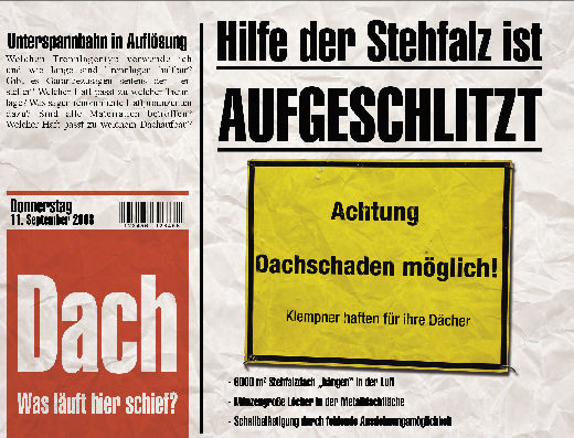 Hand aufs Herz – bereits die Neueindeckung weniger hundert Quadratmeter Stehfalzfläche kann das Aus für einen mittelständigen Fachbetrieb bedeuten. Dieses Argument ist das wohl Schwerwiegendste, wenn es darum geht, Fehlerquoten bereits in der Planungsphase auszuschließen. Die aktuelle Situation zeigt vor allem eines: Selbst nach 15-jähriger Wirrfaser-Erfahrung scheint entsprechende Aufklärung sowie der Austausch von Erfahrungen sinnvoll und nötig zu sein. Was bleibt ist die Frage: Spuken tatsächlich verwirrende Schreckgespenster unter deutschen Stehfalzdächern? Sicher nicht! Es besteht kein Grund zur Panik, wie abertausende Quadratmeter funktionierender Deutscher Stehfalzbedachungen eindeutig beweisen.