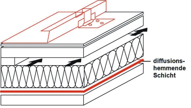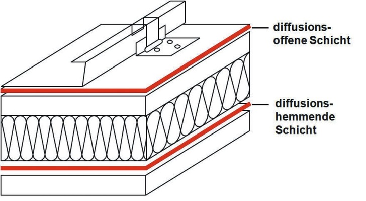 Neben einer luftdichten Gebäudehülle stellt die DIN 4108 an Gebäude mit normalen raumklimatischen Bedingungen die grundsätzliche Anforderung, dass es in der Konstruktion eines Außenbauteils und somit auch in der Dachkonstruktion nicht zu einer schädlichen Tauwasserbildung kommt, die durch Erhöhung des Feuchtegehaltes den Wärmeschutz und die Standsicherheit der Tragkonstruktion gefährdet oder zu einem Schädlingsbefall führt. Dies heißt natürlich nicht, dass keine Feuchtigkeit in die Konstruktion hineindiffundieren darf; es muss nur sichergestellt sein, dass in der Trocknungsperiode die eingedrungene Feuchtigkeit wieder hinausdiffundieren kann, um die Bilanz über das gesamte Jahr auszugleichen.