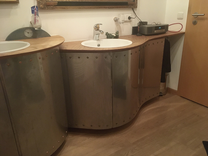 In Reih und Glied gesetzt, entfalten sogar sonst verpönte Spenglerschrauben ästhetische Wirkung. Hier halten die kleinen Alleskönner geschwungene Profile sicher an Ort und Stelle. Die Waschtischunterschränke verfügen über Türen und Verblendungen. Blechkanten wurden per Umschlag „entschärft“.