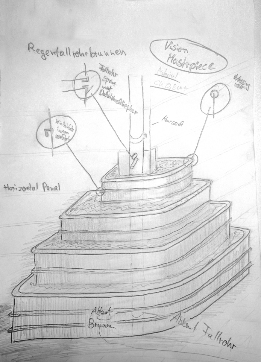 Der aus 0,8-mm-Kupfer gefertigte Brunnen verfügt am oberen Abschluss über ein genutetes Messingrohr. Die Brunnenwand wird als innen verlöteter Winkelstehfalz ausgeführt – die Kaskadenböden sind innen verfalzt und gelötet. Das Ablaufrohr wird durch die einzelnen Elemente geführt und am Fußpunkt angeschlossen. Der verschraubte Speier ist demontierbar.