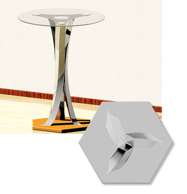 Die Profile bestehen aus vier miteinander innen und außen verfalzten Zuschnitten. Jedes Profil ist um die Hochachse des Tisches verdreht. Die Achse für die 60°-Verdrehung liegt somit außerhalb der Profile. Dies ist eine Besonderheit für die Abwicklung. Die Profile sind quasi in Leichtbauweise mit optimaler Stabilität gefertigt. Das können nur Klempner!