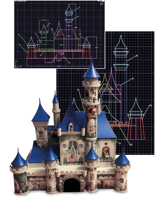 Die Planung hat begonnen: Das Schloss soll samt Mauern, Türmen und Gebäuden aus 0,6-mm-Kupfer in Handarbeit hergestellt werden. Eingesetzt werden Techniken wie Runden, Schweifen, Bördeln, Löten oder Falzen. Auch Drahteinlagen sind erforderlich. Einzig die Turmspitzen aus gedrehtem Aluminium werden zugekauft. Beeindruckend: Der Planungsstand sowie die komplexe Dachlandschaft!