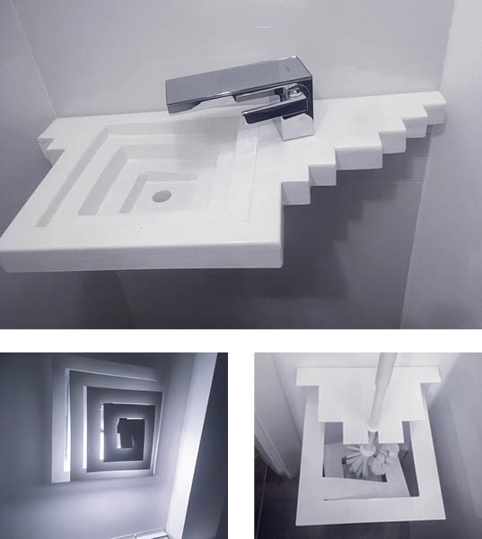 Flotter Dreier: Dieses Sanitärset besteht aus einem treppenförmigen Waschbecken und einer dazu passenden Deckenleuchte samt WC-Bürsten-Halter. Gefertigt wurde es aus Titanzink. Die einzelnen Zuschnitte wurden in Löttechnik miteinander verbunden und anschließend lackiert. Die Serie ist erweiterbar.