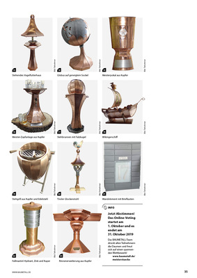Der Wettbewerb verläuft in drei Etappen: Zunächst haben die Leser das Wort. Auf www.baumetall.de/meisterstuecke sind alle Einreichungen zu sehen. Damit sie im Detail begutachtet werden können, sind die Fotos per Zoom vergrößerbar. In einem Online-Voting vom 1. bis 31. Oktober 2019 können alle Interessierten drei Lieblingsstücke per Mausklick markieren. So entscheiden die BAUMETALL-Leser, welche neun Arbeiten ins Finale kommen.