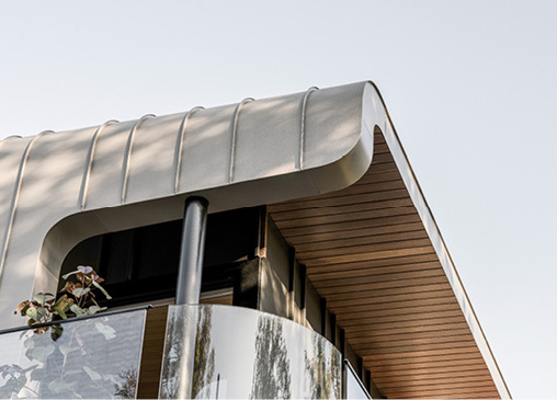 Eine weitere Herausforderung war mit der Auswahl haltbarer Materialien verbunden. Aufgrund der direkten Strandlage mussten alle eingesetzten Baustoffe äußerst langlebig und entsprechend wartungsarm sein. Titanzink und Farbaluminium eignen sich perfekt. Beide Metalle gehören zu den Materialien, die organisch geformt werden können und darüber hinaus mit einer hohen Haltbarkeit überzeugen.