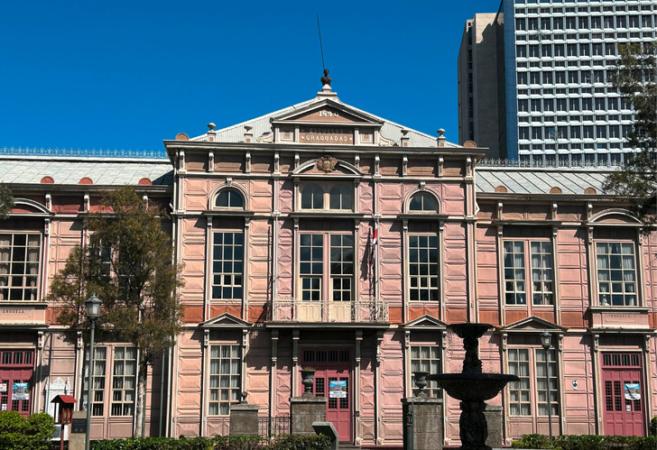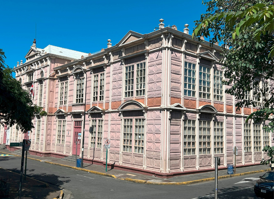 Ein Gebäude mit hohen ästhetischen Ansprüchen in einem Land ohne heimische Fachkräfte, unabhängig von den Baumaterialien, zu realisieren, ist fast unmöglich. Daher entschied sich der Architekt für einen Metallbau, der im „Danly-Metallvorfertigungssystem“ erstellt wird. Das Gebäude wurde dann auch in Belgien erworben bzw. dort von der Firma S.A. Forges d’Aiseau hergestellt. Die verschiedenen Bauteile wurden in Belgien produziert und dabei sogar ganze Fassadenteile vormontiert, wieder demontiert und jedes Einzelteil nummeriert und in einem Montageplan vermerkt. Entsprechend verpackt erfolgte der Transport von Antwerpen per Schiff nach Costa Rica, um dann in der Hauptstadt montiert zu werden. Auch nach über 130 Jahren sind die kompletten Eisen- und Blechteile am Gebäude immer noch die Originalteile! Ausgenommen vermutlich das Dach über dem Giebel des Haupteinganges. Typisch für nicht vorhandene Professionalität wurde dieser Dachbereich, wie so oft in Ländern dieser Breiten, irgendwann einmal mit Wellblechtafeln neu eingedeckt.