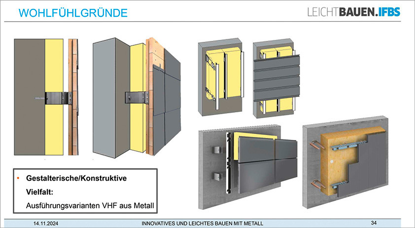 Dann präsentierte Niet zahlreiche Projektfotos und veranschaulichte, dass sich nicht sichtbare und zugleich durchdringungsfreie Befestigungssysteme in der Praxis bewährt haben. Überhaupt sei die VHF aus Metall architektonisch vielfältig und anspruchsvoll. Ein weiterer Systemvorteil sei die sortenreine Rückbaufähigkeit entsprechender Elemente und die damit einhergehende Recyclingfähigkeit wertvoller Baustoffe, denn: Alle VHF-Komponenten sind aus Metall und somit sehr langlebig und nachhaltig. Weitere Systemvorteile sind: