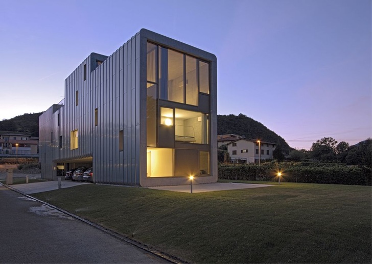 Bellavista nennen die Bewohner der Tessiner Gemeinde Mendrisio die malerische Gegend am Fuße des Monte Generoso. Tatsächlich macht das etwa 18km südlich von Lugano liegende Gemeindegebiet seinem Namen alle Ehre, denn es bietet eine wunderschöne Aussicht auf die umliegende Landschaft, die Weinberge und ein einzigartiges metallumhülltes Zweifamilienhaus. Gelassen ruht das moderne Gebäude auf einem Rasenteppich am Rande einer kaum befahrenen Quartierstraße. Von außen wirkt das hervorragend auf die Umgebung abgestimmte Haus klar und präzise. Einzig die Baustoffe Glas, Beton und Metall sind für das Auge des Betrachters sichtbar. Die Linien und Kanten sind kompromisslos durchgezogen. Kein Dachrand ragt über den Baukörper heraus – keine einzige Befestigung ist sichtbar. Sogar das Dach und die Decke des Carports sind von einem schützenden Kleid aus Metall umgeben. Kurz: Das Gebäude ist formvollendet und bis ins kleinste Detail durchdacht. Es besteht aus zwei gespiegelten Wohneinheiten, deren Basen jeweils den Eingangsbereich mit Garderobe und Gästezimmer beherbergen. Der Freiraum zwischen beiden Gebäudevolumen, ein sogenannter Portico, lässt Blicke auf die umliegende Landschaft zu und sorgt dabei für Transparenz und Leichtigkeit.