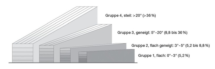 - Dachneigungsgruppe II> 3 bis 5° (>5,2 bis 8,8 %) (flachgeneigtes Dach)