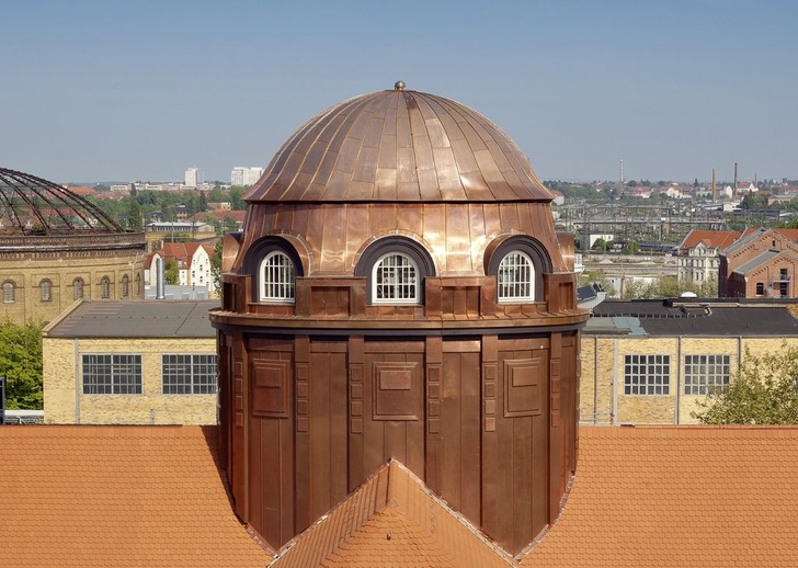 Nach mehr als 60 Jahren glänzt der 13m hohe, mit Kupfer bekleidete Turm wieder auf dem Leipziger Stadtbad. Die aus Stahl und Holz hergestellte Neukonstruktion ist eine originalgetreue Nachbildung. Unter dem glänzenden Kupferkorsett verbergen sich 8,6 t Stahl und 11 t Holz. Der neue Turm thront in über 30 m Höhe auf dem sanierten Dach der ehemaligen Badeanstalt und zeugt von einer perfekten Handwerksleistung.