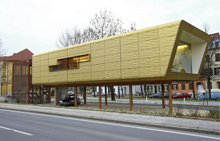 Ausführliche Infos über das mit einer dreidimensionalen Kupfer-Werkstoff-Fassade ausgestattete Raumkonzept „Box:09“ sind online abrufbereit. Das Raumwunder eignet sich optimal für kleine Grundflächen. Unter der hier abgebildeten Büro-Box befinden sich zusätzliche Parkplätze.