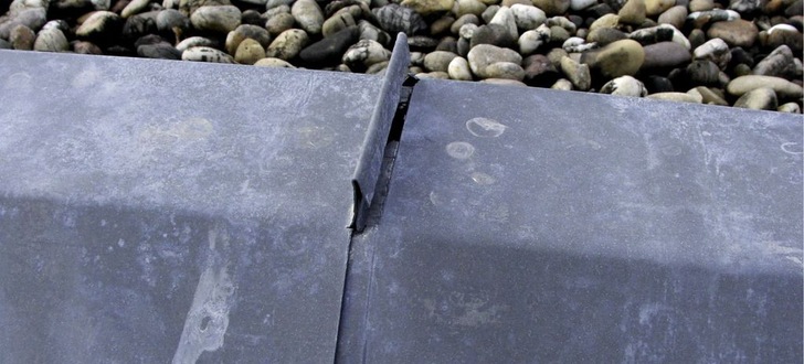 Das Phänomen ist nicht neu – dennoch werden immer wieder dieselben Fehler begangen: Wer Metallprofile, gleichgültig welcher Art, ohne entsprechende Ausdehnungsmöglichkeiten montiert, riskiert kapitale Bauschäden. Unabhängig von der Größe entsprechender Metallzuschnitte ist die Folge so gut wie immer eine Totalsanierung. Das hier gezeigte Schadensbild verdeutlicht auf abschreckende Weise, was geschieht, wenn sich Attikaabdeckungen nicht ungehindert ausdehnen und wieder zusammenziehen können. Die auftretenden Schäden liegen in der gewählten Verbindungstechnik begründet. Ohne Rücksicht auf Verluste wurden etwa 350m Attikaabdeckung ausnahmslos mit einfachen Stehfalzen verbunden. Die zahlreich vorhandenen Innen- und Außenecken der Flachdach-Randabdeckung wurden zur Sicherheit zusammengelötet. Zweifellos wurden alle Falz- und Lötverbindungen sorgfältig ausgeführt. Dennoch (und zugegeben nicht wirklich überraschend) sorgten die durch das Ausdehnungsverhalten auftretenden Scherkräfte dafür, dass die Falze wie Papier abgerissen und die Lötnähte stark deformiert wurden.