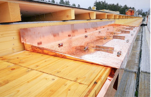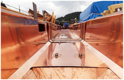 Eine besondere Aufgabe kommt der aus 0,8-mm-Kupfer hergestellten Einlegerinne zu. Um auf einer Gesamtlänge von mehr als 250 m dauerhafte Sicherheit zu gewährleisten, wurden speziell angefertigte Dehnungsausgleicher verbaut. Dazu wurde die serienmäßige Dicke des vulkanisierten Neopren- bzw. EPDM-Dehnfugenbandes zwei Stufen stärker als üblich dimensioniert. Damit eine Dachentwässerungsanlage dieses Ausmaßes fehlerfrei und zuverlässig funktioniert, ist eine exakte Rinnenberechnung erforderlich. Zur Dimensionierung der Rinnen, Abläufe und Notüberläufe wurde die neue Suissetec-Wegleitung herangezogen. Entsprechend großformatige Einlegerinnen sorgen mit Zuschnitten bis zu 1250 mm für ausreichende Sicherheit. Um die Abflussleistung zu optimieren, wurden die Abläufe mit exzentrischen Übergängen von eckig auf rund hergestellt. Sämtliche Gehrungen und Nähte der Rinne wurden mit einem speziellen Phosphorlot nicht lösbar, stoffschlüssig miteinander verbunden. Eine weitere Besonderheit stellen die Halterungen für die Rinnenheizung dar. Sie wurden bereits in der Vorproduktion im Rinnenlauf aufgeschweißt.