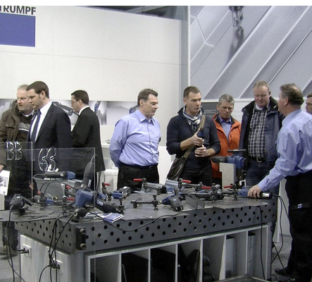 An drei in den Messestand integrierten Arbeitstischen können Fachbesucher bei Trumpf verschiedenste Elektrowerkzeuge des Unternehmens testen. Vertriebsleiter Johannes Wetzel dazu: „Natürlich können wir die Leistungsfähigkeit unserer Elektrowerkzeuge mit vielen Daten und Fakten beschreiben. Echte Blechprofis vom Bau lassen sich aber vor allem durch handfeste Beweise überzeugen.“ Zentrum des Messeauftritts bilden insbesondere Produkte zur Dünnblechbearbeitung. Handwerker des Dach- und Fassadenbaus werden ebenso wie Heizungs-/Lüftungs- und Klimatechniker live erleben, wie unter anderem die 1,3 kg leichte Akkuschere Tru Tool S 130 mit bis zu 7 m/min durch bis zu 1,3 mm dicke Bleche schneidet. Dabei lässt diese Schere auch in punkto Kurvengängigkeit und Handlichkeit kaum Wünsche offen. Ebenfalls zu sehen und zu testen sind die verschiedenen Nibbler und Profilnibbler von Trumpf. Sie zeigen ihre Stärken beim Einsatz an Profilblechen auf Dächern und Fassaden sowie im Behälter- und Karosseriebau. So eignet sich beispielsweise der Profilnibbler Tru Tool PN 161 selbst für tiefe Diagonalschnitte in Trapezblechen. Ein werkzeugloser Stempel- und Werkzeugträgerwechsel ist selbstverständlich.
