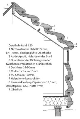 Um trotz des engen Kostenrahmens die Vorteile des Werkstoffs nutzen zu können, wurde nichtrostender Stahl (EN 1.4404) mit einer Dicke von nur 0,127 mm verwendet. Vor der Montage wurden die Bleche mithilfe einer futuristisch anmutenden Walze mit großen Gumminoppen kontrolliert geknittert. Die 1m breiten Bahnen wurden anschließend horizontal von unten beginnend an der Holzkonstruktion befestigt. Oberhalb der Fensterbänder ist die Verkleidung über die schräge Dachkante hinweg weitergeführt und erzeugt so eine diagonale Struktur an den Giebelseiten der Ateliers. Auch die Anschlüsse der metallischen Bekleidung, zum Beispiel an die Fenster, konnten mit diesem Fassadensystem problemlos ausgeführt werden. Der nach der Montage des Folienkleides in zwei Schichten von innen aufgesprühte FCKW-freie Isolierschaum dient zugleich der Aussteifung und der Wärmedämmung.