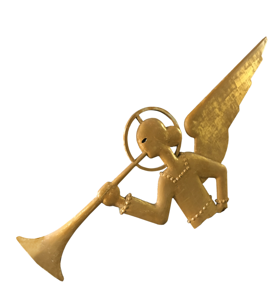 Die Windfahne auf dem 45 m hohen Glockenturm des 1925 bis 1926 erbauten Gotteshauses wurde durch einen Sturmschaden beschädigt. Die in Form eines musizierenden Engels gestaltete Windfahne drohte, jeden Augenblick in die Tiefe zu stürzen. Eilig zur Hilfe gerufene Höhenretter sicherten den himmlischen Rockstar, indem sie ihn an der Bruchstelle auseinandertrennten und den oberen Teil der Figur auf den Boden der Tatsachen verfrachteten. Der von der Engelsbrust abwärts auf dem Turm verbleibende Windfahnenrest war somit tatsächlich nur noch die Hälfte wert – vielleicht sogar noch weniger als das. Und fast so als sei der himmlische Hilferuf erhört worden, beauftragte die Kirchengemeinde den Fachbetrieb Lorenz Sporer mit dem Abbau der unteren Engelhälfte und der fachgerechten Restauration des Wetterengels.