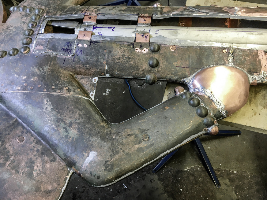 „Als der unsachgemäß zerlegte St. Gabriel vor uns stand, breitete sich eine seltsame Stimmung in unserer Werkstatt aus“, erinnert sich Caroline Sporer. „Traurig sah er aus – der einst so stolze Engel mit seiner Flügelbreite von fast 3 m.“ Wieder zusammengesetzt sollte er zu seiner ursprünglichen Größe von knapp 3 m Höhe zurückfinden. Doch bis es so weit war, lag noch jede Menge Arbeit vor den Ornamentenspenglern. Und wie immer musste sich das Sporer-Team auf zahlreiche Überraschungen und Anforderungen einstellen, die erst mit Beginn der Arbeit zutage traten. Passend dazu heißt es an einer weiteren Textstelle des eingangs erwähnten Popsongs: „Ich denke, heute Nacht können wir über all das reden, was falsch gelaufen ist, und versuchen, die Sache wieder geradezubiegen.“ Ob Werkstattleiter Detlef Rheinwein und sein Kollege Daniel Bausch ihren Patienten singen hörten und ihm daraufhin tief in die Augen geschaut haben, entzieht sich unserer Kenntnis. Die sich anschließende erfolgreiche Operation ließe allerdings den entsprechenden Rückschluss zu.