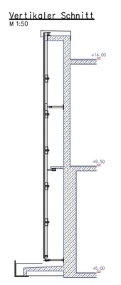 Natürlich erfüllen das für den Wiederaufbau der Fassade eingesetzte System sowie dessen aufeinander abgestimmte Leitprodukte die hier genannten Vorgaben. Die Fassade wurde aus statischen Gründen als hängende Fassade konzipiert. Tragendes Element für die Vertikallasten ist dabei die Betonauskragung im Attikabereich – die Horizontallasten werden an die mittlere Betonauskragung beziehungsweise im unteren Bereich direkt an die Rohbauwand übergeben.