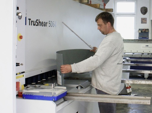 Der Fachbetrieb Messerschmidt hat seit Juli einen „neuen Mitarbeiter“. Mit der Anschaffung der Trumpf-Tafelschere TruShear sind die Fambacher Klempner in der Lage, bis zu 4m lange und 6mm starke Metalltafeln beliebig zuzuschneiden. Das Investitionsvolumen dieser Maschine liegt bei 100000 Euro. Die Investition verdeutlicht, dass Michael Messerschmidt mit entsprechender Weitsicht auf neue Marktgegebenheiten reagiert.