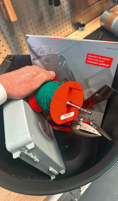 „ … einen Rinnenschnurabroller für Akkubohrmaschinen“, sagt Stefan Burger, „weil die Rinnenmontage damit schneller wird“. Für Sabine Drescher ist das M.A.S.C.-Hebeleisen ein unverzichtbares Masc-have. Das leichte Edelstahlwerkzeug ist stabil und flexibel für Stemm- und Hebelarbeiten sowie zum Ziehen von Nägeln einsetzbar. Mindestens ebenso praktisch ist der M.A.S.C.-Wulstausbeuler, den Stephanie Winter in den Eimer packt, doch damit nicht genug: Für Christian Semler sind die M.A.S.C.-Ideal-Blechscheren mit Skala unverzichtbar. Von den knallroten Qualitätsscheren legt er darum je eine linke und eine rechte in den Eimer. „Das Besondere sind die auf den Schneiden der Scheren eingeätzten und somit sehr gut ablesbaren Millimeterskalen“, sagt Semler. Inzwischen ist der von Sascha Klindworth bereitgestellte Eimer schon gut gefüllt. Irgendwie schafft es Benedict Fischer dennoch, ein M.A.S.C.-Clip-Master-Set-25 dazuzulegen. Es besteht aus einer mit aufgelegtem Magnet ausgestatteten Clip-Master-Zange sowie zwei dazu passenden FC25-Fixier-Clips. „Die kleinen Clips leisten Großartiges und sind dabei wie eine dritte Hand“, schwärmt Fischer, der das Clip-Master-Set zum Beispiel zum Fixieren, Festhalten oder Justieren von Blechen beim Falzen oder Löten empfiehlt.