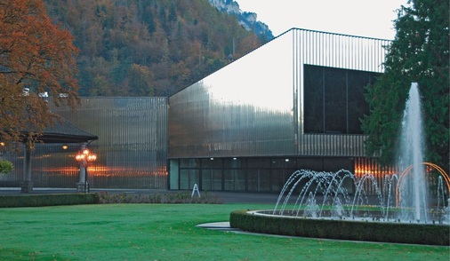 Im Zentrum von Interlaken befindet sich direkt neben dem historischen Casino der neue Kongresssaal. Die homogene Edelstahlbekleidung des Neubaus erfüllt die übergeordnete Gestaltungsidee, ein neutrales Gebäude zu errichten, perfekt. Dies gilt sowohl hinsichtlich des Materials als auch beim Farbkonzept des imposanten Bauwerks. Während die gut einsehbare Edelstahl-Dachlandschaft wie eine fünfte Fassadenfläche wirkt, spiegeln hochglänzende Fassaden die Umgebung als facettenreiches Bild. Dabei ist der Baukörper einerseits präsent, nimmt sich aber andererseits in der Wahrnehmung des Betrachters deutlich zurück. Dieser Balanceakt gelingt vor allem dank der beispielhaften Selbstverständlichkeit und dem selbstbewussten Auftritt des Gebäudes. Auch die angrenzende und sensible Silhouette des historischen Ensembles, bestehend aus einer Parkanlage und unterschiedlichen Gebäuden, profitiert vom Glanz des neuen Kongresssaales. Die aus vertikal angeordneten und spiegelnden Paneelen bestehende Metallhaut des Monolithen nimmt die Strukturen, Farben und Formen der Umgebung regelrecht auf und wirkt dabei dennoch ausgesprochen homogen.