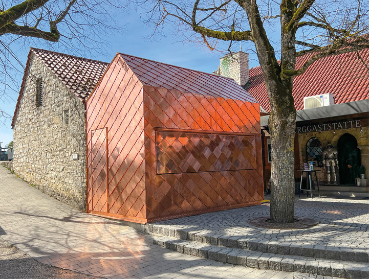 Der Begriff Klampferer beschreibt das weithin hörbare Geräusch, wenn Metall mit Hämmern bearbeitet wird. Im Gegensatz zum Harnischmacher stellte der Klampferer Zier- und Gebrauchsgegenstände wie Eimer, Essen, Vasen oder Kannen her. Auch die Fertigung von Blechflaschen gehörte zum damaligen Berufsbild, woraus sich der in Schwaben geläufige Begriff Flaschner ableitete. Genauso ein Flaschner ist Harald Wurster aus Bempflingen. Gemeinsam mit seinem Team zeichnet er für die Bekleidung des neuen Kiosks im Hof der Burg Hohenneuffen verantwortlich. Bei der Planung, Anfertigung und Ausführung der kleinformatigen Fassadenbekleidung des neuen Kiosks mussten die Fachleute der Wurster GmbH einiges beachten. Um zum Beispiel an den Außenecken jeweils mit einer ganzen oder halben diagonal verlegten Schindel abschließen zu können, wurden alle Schindeln als Sonderanfertigung hergestellt.