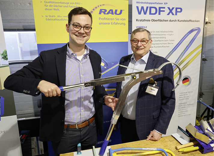 Gerade im Winter bei starker Schneelast sind dicke und stabile Rinnenhaken an der Dachrinne unerlässlich. Mit dem Rinnenhakenbieger RHGB von Rau wird Handwerkern bei der Herausforderung des Biegens starker Rinnenhaken geholfen. Durch die neuartige Bauweise aus Edelstahl verfügt der RHBG über eine hohe Festigkeit und spart Kraft beim Biegen. Die langen Griffe ermöglichen das Arbeiten mit geringem Kraftaufwand durch den Hebeleffekt. Mit dem leicht zu verstellbaren Anschlag kann selbst bei einer großen Anzahl zu biegender Haken ein gleichbleibendes Biegeergebnis (Winkel) erreicht werden. Ein weiterer großer Vorteil beim Arbeiten mit dem RHGB ist: Das Übertragen der Risslinie von der Rückseite auf die Vorderseite entfällt! Es kann gleich auf der angezeichneten Risslinie gebogen werden, was wiederum zeitsparendes Arbeiten begünstigt. Besucher der Kaufmann-Messe waren begeistert – Kunden, die bereits mit einen Rinnenhakenbieger RHGB von RAU arbeiten, sagen: „Das ist das coolste Werkzeug, das ihr habt!“ Das freute besonders den Jungunternehmer Frederik Rau, der das Familienunternehmen in der vierten Generation in Bayern fortführt.