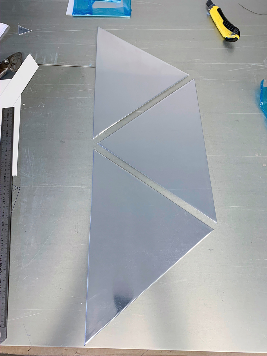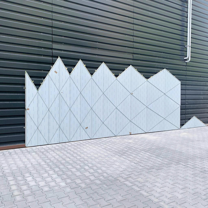 Auf den bis zu 12 m hohen, betonierten Außenwänden des Blockheizkraftwerks befestigte das Montageteam von Fleischer Metallfaszinationen zunächst zahlreiche Fassadenkonsolen, die mineralische Wärmedämmung und eine aus Aluminiumprofilen bestehende, senkrecht angeordnete Montageebene. Anschließend erfolgte die Installation der waagrecht verlaufenden Trapezprofiltafeln als Befestigungsebene für die Aluminiumschindeln. Die Montage der Unterkonstruktion sowie der mit entsprechenden Positionsnummern gravierten Schindeln wurde vom Rollgerüst bzw. dem Scherenlift aus erledigt. Zur indirekten Befestigung der Aluminium-Dreiecke kamen klassische Liegehafte und Nieten zum Einsatz.