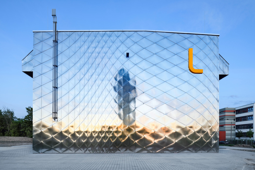 Die Metallfassade des Blockheizkraftwerks Möckern (Leipzig) ist ein echter Hingucker. Sie besticht durch matt spiegelnde Schindeln aus eloxiertem Aluminium, die den Baukörper wellenförmig umkleiden. Scheinbar, denn erst bei genauerem Hinsehen wird klar: Die Anordnung der indirekt befestigten, dreieckigen Metallelemente folgt einem ganz bestimmten geometrischen Muster.