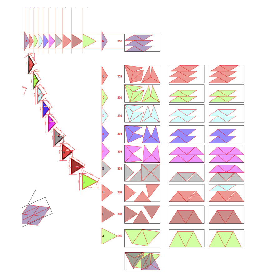 Um die raffinierte Anordnung der Dreiecksschindeln besser zu verstehen, ist eine Exkursion in die Grundlagen der Geometrie durchaus angebracht. Wir erinnern uns: Ein herkömmliches Geodreieck ist ein Lineal in Form eines rechtwinkligen, gleichschenkligen Dreiecks. Per Definition sind bei einem gleichschenkligen Dreieck mindestens zwei Seiten gleich lang. Diese beiden Seiten bzw. Schenkel bilden zusammen mit der Basis die Dreiecks-Grundform. Der Punkt, an dem beide Schenkel zusammentreffen, ist die Dreiecksspitze und der entsprechende Winkel ist der Winkel an der Spitze. Gegenüberliegend befindet sich die Grundlinie des Dreiecks. Und der Abstand vom Winkel an der Spitze bis zur Grundlinie ist die sogenannte Dreieckshöhe. So weit, so verstanden.