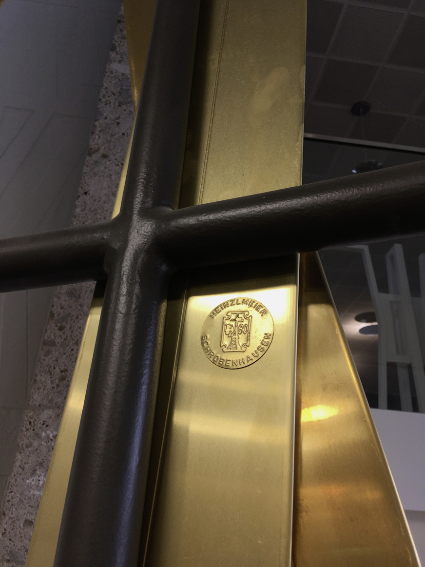 Raffiniert: Die Knotenpunkte der Unterkonstruktion werden durch die Metallstreifen verdeckt und die Unterkonstruktion somit in den Hintergrund gerückt. Ein weiterer Kunstgriff ist die nahezu unsichtbare Befestigung der Metallstreifen durch Umwickeln des obersten Handlaufes. Das Ergebnis ist ein nach außen strahlender Nestbau aus Messing- und Kupferbändern, der alle Blicke auf sich zieht. Die Anordnung der einzelnen Bänder hatten die Architekten in einem 3D- Zeichenprogramm exakt festgelegt. Aufgabe der Spengler um Firmeninhaber Norbert Heinzlmeier war es, diese Anordnung zu übernehmen.