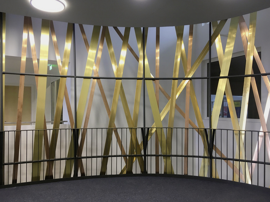 Warum die Bekleidung den Beinamen „Vogelnest“ trägt, ist auf den ersten Blick erkennbar: Die bis zu 7,5 m langen und bis zu 160 mm breiten Metallstreifen sind in einer unregelmäßigen Anordnung so vor dem Treppenhaus aufgehängt, dass ihr Verlauf von fast lotrecht bis leicht diagonal variiert und sie sich kreuzen. Dabei wurden sie mal übereinander und mal untereinander hindurchgeführt, sodass sie ein halbkreisförmiges Geflecht bilden. Durch diese Anordnung entstand ein halber bauchiger Zylinder in Form einer überdimensionalen aufrechten Tonne. Um Lebendigkeit in den Raum zu bringen, haben sich die Architekten für eine Auswahl von drei verschiedenen Legierungen mit entsprechenden Farbtönen entschieden: Bronze, Messing und Gold. Umgesetzt wurde dies mit den Oberflächen Nordic Bronze, Nordic Brass sowie Nordic Royal von Aurubis. Die Bänder weisen unterschiedliche Breiten und Zuschnitte auf. Zum Beispiel sind die Bronzebänder bei einem Zuschnitt von 160 mm exakt 80 mm breit. Die Nordic-Brass-Bänder sind 125 mm und Streifen aus Nordic-Royal 160 mm breit. Von jeder Legierung wurden im Schnitt über 130 m verarbeitet.