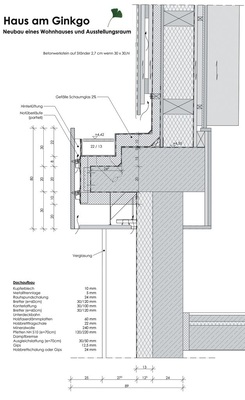 Entgegen der bei vorpatinierten Kupfertafeln meist üblichen Lieferlängen von 3000 mm, weisen einige der einfach gefalzten Horizontalscharen Sonderlängen auf. Das stückpatinierte Material stammt aus der gut 10 m langen Klimabox des SHK-Betriebes Sanibär. Die im schwäbischen Nürtingen-Zizishausen ansässige Firma stößt mit dem chemischen Verfahren zur Nachpatinierung von Kupfer- und Titanzinkflächen in eine Marktlücke. Mittlerweile sind neben der Stückpatinierung bei Sonderlängen die patinierten Sonderbauteile vor allem im Bereich des Denkmalschutzes sehr gefragt. Geschäftsinhaber Jürgen Leuchte: „Wozu die Natur sonst 30 bis 50 Jahre benötigt, geschieht in unserer Klimabox innerhalb nur eines Tages. Selbst Sonderbauteile wie Turmspitzen, Wetterfahnen oder Ziergegenstände können wir patinieren.“ Durch den Einsatz der überlangen, patinierten Kupferscharen kommt die Dachflächenstruktur des Hauses am Ginkgo ohne störende Querfalze aus. Die lineare Dachstruktur ist dabei wichtiger Bestandteil der harmonischen Umsetzung des Gebäudekonzeptes.