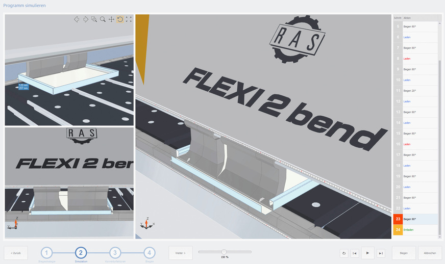 Typisch RAS läuft die Bendex-Software direkt auf der Maschinensteuerung. Die Software erstellt die Biegeprogramme mit einem einzigen Mausklick, ausgehend von am Bildschirm gezeichneten Profilen oder importierten Biegeteilgrafiken. Dies können STEP-, DXF-, DWG- oder GEO-Dateien sein. Die Programme lassen sich an der Maschine oder im Büro generieren. Damit die Software die Programme mit den realen Maschinendaten erstellt, werden per Datenleitung die jeweils aktuellen Maschinenparameter in die Office-Software geladen. Das beinhaltet etwa auch die tatsächlich an der Maschine verfügbaren Werkzeuge. Die erstellten Biegeabläufe kann man sich vorab in einer 3D-Simulation ansehen und bei Bedarf auch in den Ablauf eingreifen. Die einfache Bedienung reduziert die Schulungsdauer auf ein Minimum.