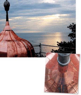 Berichte von Baustellen mit Seeblick können durchaus Fernweh verursachen. Erst recht, wenn farbenprächtige Fotos eine romantische Abendstimmung zeigen und Klempnerarbeiten im lichtgefärbten Wasser widerspiegeln. Um solche Augenblicke zu erleben, müssen Klempner aus Württemberg nicht unbedingt in die Südsee auswandern. Auch im Wasser des schwäbischen Meeres spiegelt sich so manche gelungene Klempnerarbeit. Beispielsweise der kupferne Turm einer kleinen aber feinen Villa in Langenargen. Sozusagen nur einen Schaleisenwurf vom Bodenseeufer entfernt, befindet sich das Dach des um 1915 erbauten Schmuckstückes. Die Villa war in die Jahre gekommen und musste komplett saniert werden. Ursprünglich wurde in der Ausschreibung für die neue Kupferbedachung des achtseitigen Turmes eine Querbanddeckung gefordert. Allein der Gedanke an diese handwerklich zwar einfach herzustellende, jedoch von Klempnerästhetik weit entfernte Lösung, verursachte bei Klempnermeister Martin Fiederer aus Ravensburg mehr als nur Kopfzerbrechen. Nach einigen Diskussionen mit dem Landesdenkmalamt führten die Klempner der Fiederer GbR schließlich in Anlehnung an die Originaleindeckung eine vertikal verlaufende Stehfalzeindeckung aus.