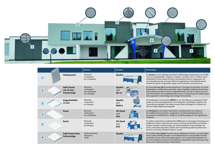 Trotz der Vielzahl der Fassadenprofile wirken die Rheinzinkfassaden harmonisch und machen Lust auf mehr. Der Beitrag stellt neben den diversen Profiltypen auch die entsprechenden Maschinen vor. Eine weitere Hilfestellung bietet eine entsprechende Anfahrtsskizze ins schöne Friedewald, die der Online-Version dieses Beitrages beigefügt ist. Somit steht der Besichtigung der neuen Schlebach-Fassade in den farben Blaugrau und Weiß nichts mehr im Wege.
