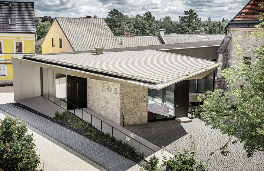 Markant sind die bronzefarbenen Spitzen, die sich um die kleine Kirche aus dem 14. Jahrhundert recken. Der Baukörper ist flach, umfasst die Apsis der Kirche, rückt dennoch von ihr ab und formt zwei spitz zulaufende Vordächer. Das Architekturbüro Arkform baute das neue Pfarrzentrum Fokus in Sierning mit angemessener, eleganter Dringlichkeit. Man merkt den Architekten die Lust am Bauen an: Machen, umsetzen, tun, darum geht es ihnen seit Jahren. Mit diesem Bauwillen und ­entsprechender Erfahrung verändern sie Dorfplätze, Hafengebiete, Firmensitze und Berghotels – dieses Mal mit unübersehbarer Beteiligung kreativer Spengler.