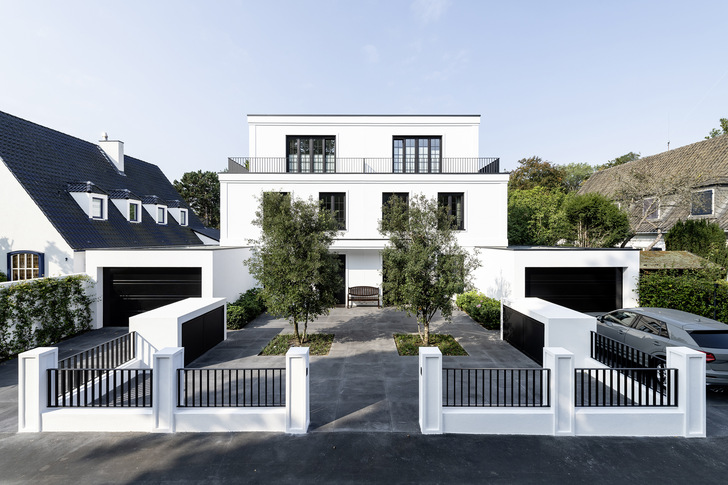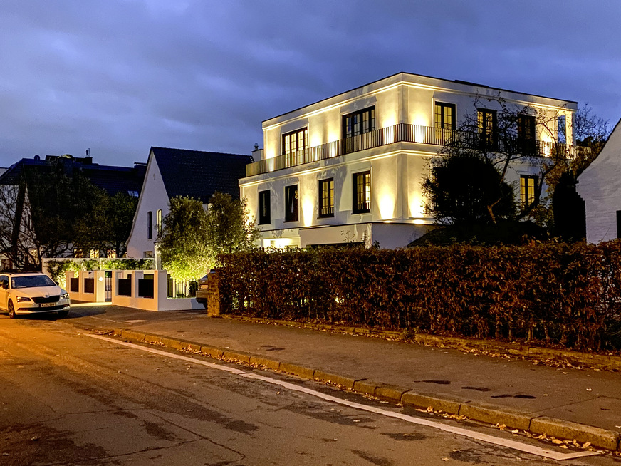 In der Nähe des Stadtwaldes im Kölner Westen wurde nach etwa 18 Monaten Bauzeit vor Kurzem ein Haus fertiggestellt, das wie ein großzügiges Einfamilienhaus wirkt, tatsächlich jedoch zwei Doppelhaushälften birgt. Die beiden Hälften spiegeln sich bis in die Müllkästen, Garagen, Einfahrten, Vorgartenpfosten so perfekt, dass man sofort an große, bedeutende zentralperspektivisch angelegte Vorgängerbauten denkt, z. B. im Alten Ägypten. Der Baukörper des Hauses besteht im Prinzip aus drei übereinandergetürmten Bauteilen, die auf dem jeweils unteren mit schmalen Rücksprüngen aufsetzen. Wir haben hier also etwa die Form einer Stufenpyramide vor uns. Der Eingangsbereich in das Anwesen, vulgo: Vorgarten, ist weit vorgezogen, gepflastert und zur Straße hin durch einen Zaun zwischen Pfosten begrenzt. An diesen Pfosten kann man sogleich ein Gestaltungselement beobachten, welches das Haus selbst aufnimmt und so die für manche gewisse Strenge des Entwurfs abmildert: An den Hausecken sind Lisenen, also Mauerblenden, ausgebildet, die wenige Zentimeter vorspringen und in der Horizontalen am oberen Rand der Geschosse durch ein zweifach abgetrepptes Gesims aufgenommen werden. Die Geschosse bekommen dadurch eine Rahmung.