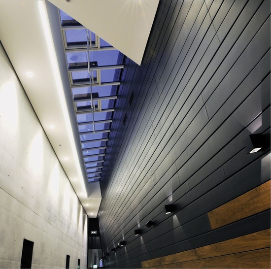 Insbesondere entlang der Laufwege integrierten wir dazu spezielle Edelholzpaneele. Aufgrund ihrer Kratzunempfindlichkeit bieten diese Holzelemente einen gewissen Schutz. Außerdem lockern sie die Innenfassade optisch auf. Inzwischen wird das Gebäude rege genutzt. Dabei zeigt sich, dass die Titanzinkoberfläche absolut unempfindlich ist und noch immer aussieht wie am Tag der Bauabnahme.