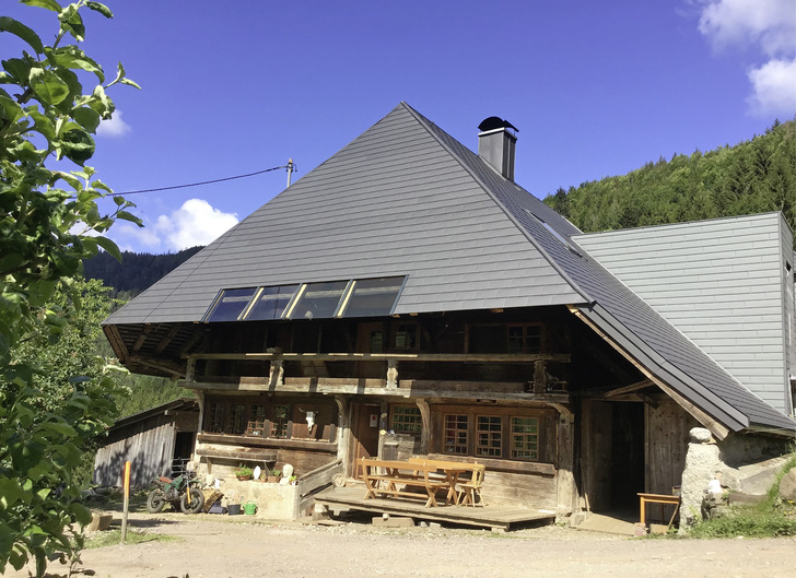 Der alte Hof der Familie Bender in St. Wilhelm, einem Ortsteil von Oberried im idyllischen Freiburger Land, ist ein typisches Schwarzwaldhaus. Der wesentliche Baubestand des alten Holzhauses mit einem Obergeschoss und einem später ausgebauten Dachgeschoss stammt aus dem Jahr 1774, ist also bald an die 250 Jahre alt und hat manche Stürme erlebt. Da ist es nicht verwunderlich, dass ein solcher Bau einmal ein neues Dach braucht, nicht zuletzt, um den historischen Baubestand zu schützen. Der Hof wird noch immer als Hof bewirtschaftet, angebaut wurde vor inzwischen einigen Jahren im hinteren Teil eine moderne Scheune, in der bis heute auch Vieh untergebracht ist. Dieser jüngere Anbau, der hintere Bereich des gesamten Baus, ist noch immer mit Schiefer eingedeckt.