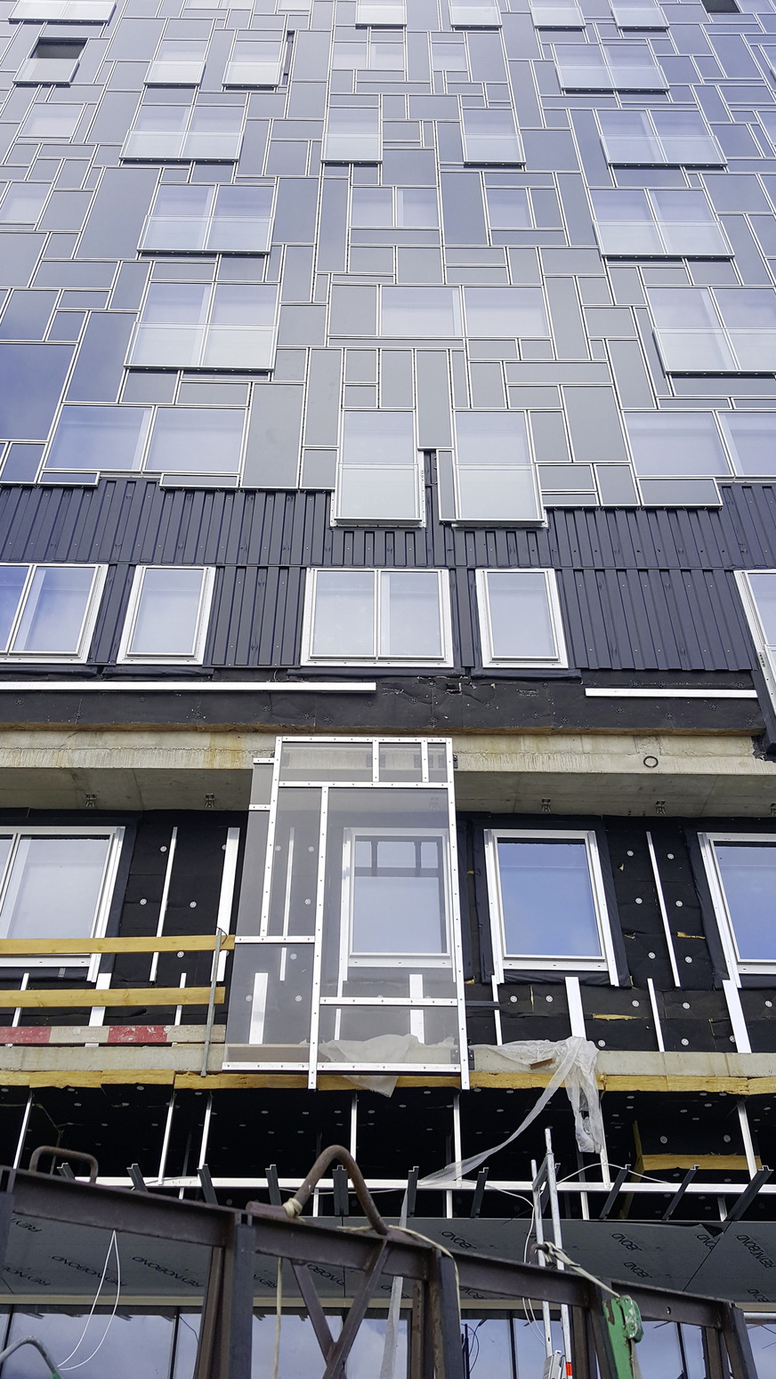 Die fragmentierte Fassade besteht aus 7000 Einzelteilen. Trotz der Fragmentierung wird der Turm als Monolith wahrgenommen, was Kathrin Aste besonders betont. Ein spannendes Detail dabei ist, dass die einzelnen Geschosse nicht sichtbar sind. Das Objekt hat insgesamt 100 000 m³ und 25 000 m² Bruttofläche. „Die Massivität spürt man dennoch nicht“, betont Ludin. Dies ist vor allem auch der Materialauswahl zu verdanken. „Glas und Metall sind für große Bauvorhaben interessant. Sie machen das Objekt durch ihre Reflexionsfähigkeit lebendig. Beide Materialien verändern sich im Laufe der Tages- und Jahreszeiten. Das Objekt erstrahlt stets in unterschiedlichen Farben“, erzählt Aste.